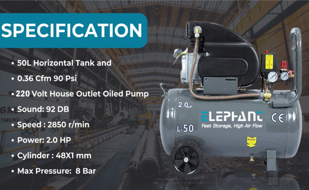 Elephant’s 2.0 HP Air Compressor (AC50C) is equipped with copper-binding engineered pump cylinder and piston for higher output and improved job site performance. The AC50C delivers industrial power and results with improved durability for tough job site conditions.