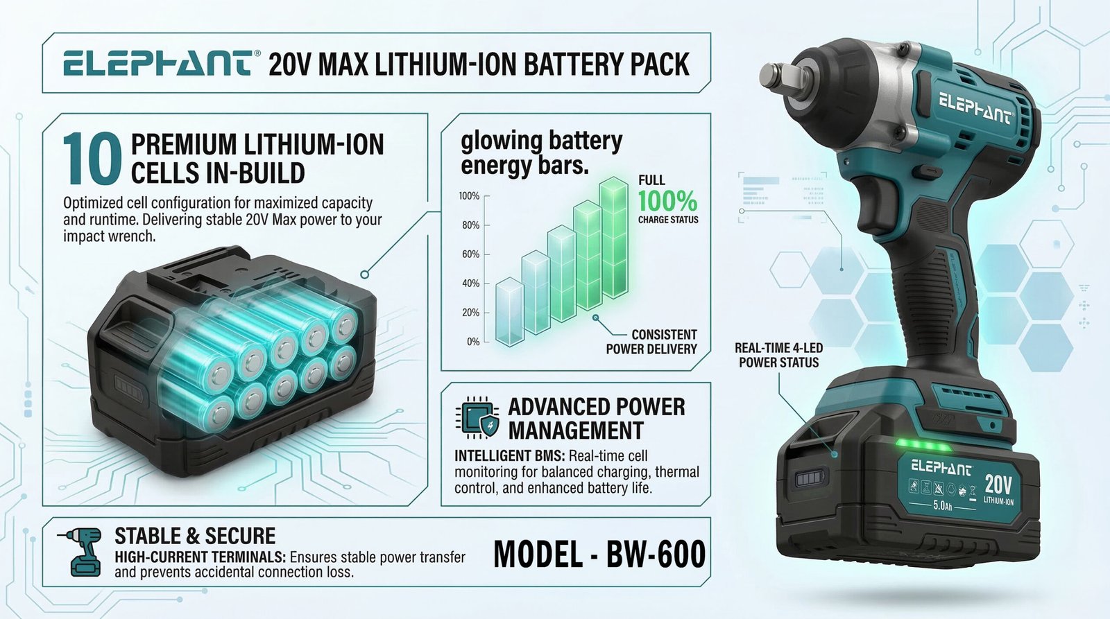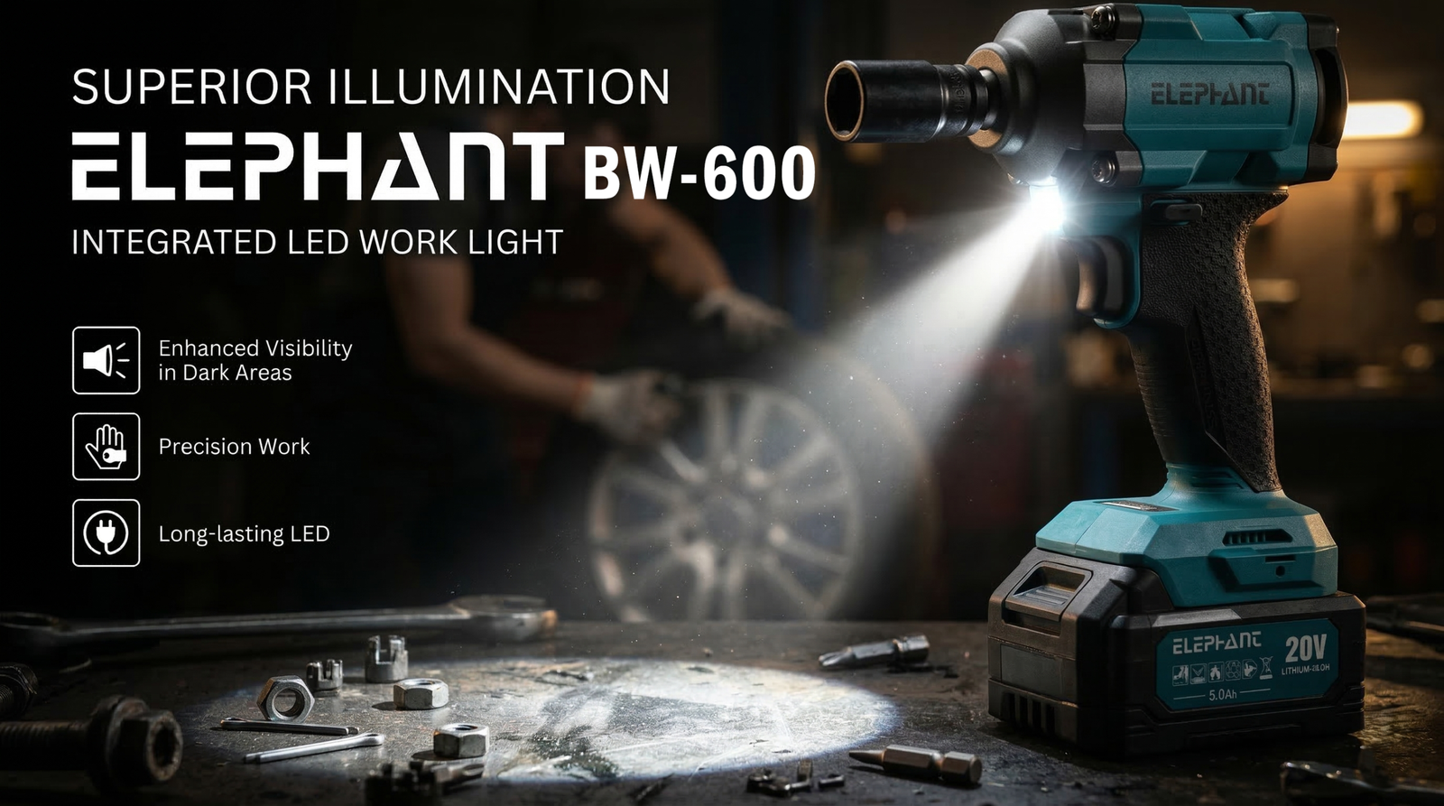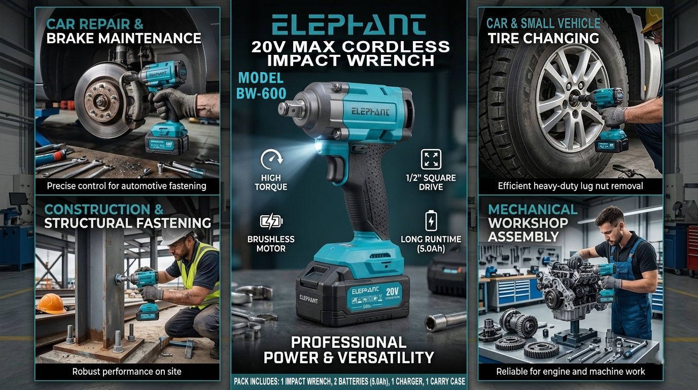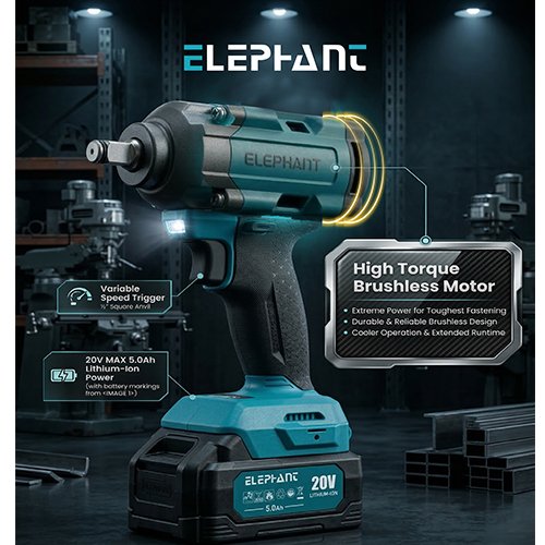 Elephant Heavy Duty 20V Cordless Impact Wrench with 2 Batteries | Build-In LED Lights | Forward & ReverseSwitch BW-600.