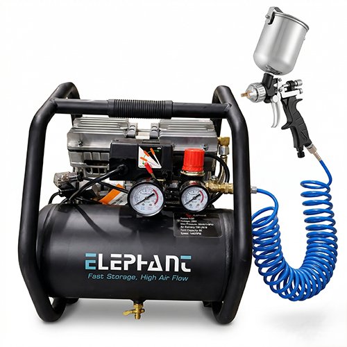 Elephant Oil free & Noiseless Air Compressor 6 Ltr. and Painter Plus Spray Gun PS 01 with PU Pipe & Fittings (AC 6L – PS 01)
